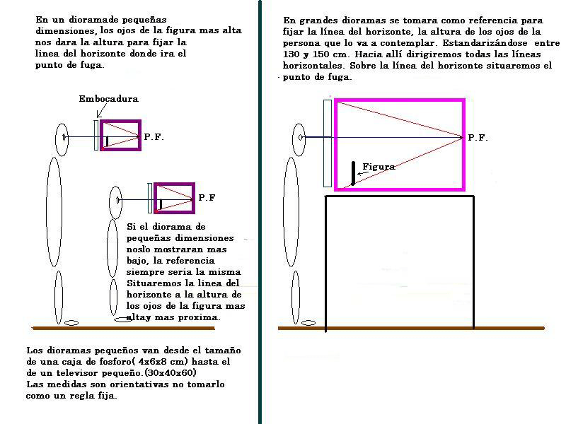 En dioramas pequeños los ojos de la figura principal nos dará la altura para fijar la línea del horizonte donde irá el punto de fuga. Este sería un plano normal. En cambio, en dioramas grandes se tomará como referencia para fijar la línea del horizonte, la altura de los ojos de la persona que lo va a contemplar. Hacía allí dirigiremos todas las líneas horizontales. Sobre la línea del horizonte situaremos el punto de fuga. Aquí obtendríamos un plano en picado para ver la figura principal.